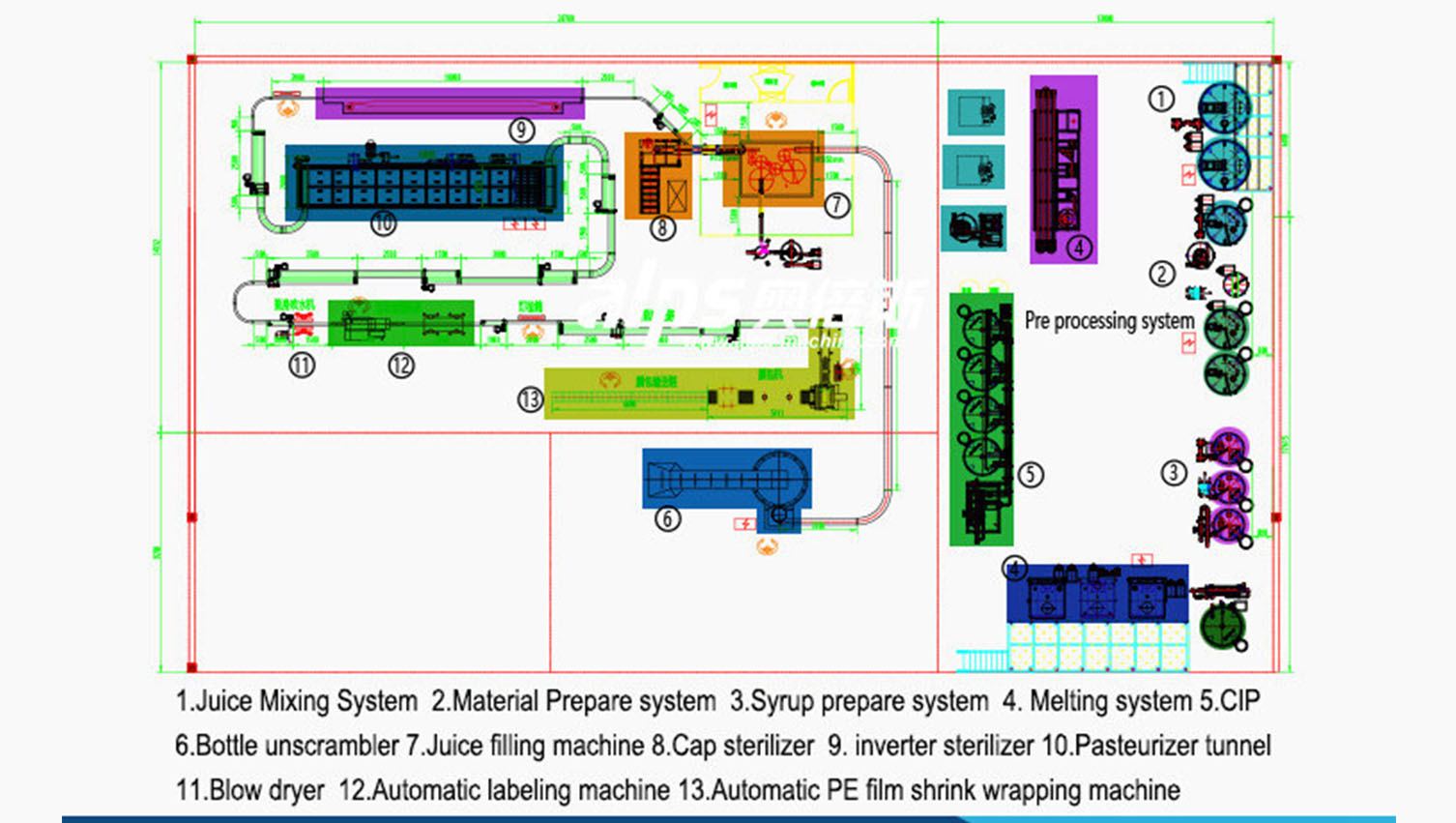 We supply complete solution for the juice production line, including Water treatment system / Syrup melting system / Juice Mixing system / Sterilizer system / Washing filling and capping machine / Pasteurizer tunnel / Bottle Juice Filling Machine / Hot Juice Filling Machine / Automatic labeling machine / Automatic packing machine / Automatic Palletizer system