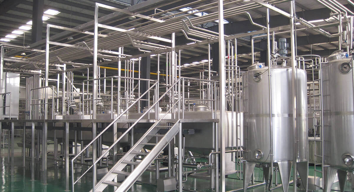 Complete juice processing system with reasonable mixing and sterilization technology, not only can be suitable for common products, but also can satisfy special requirements of customers, for example juice, milk, cream or high viscosity products containing fiber and large pulp granules.