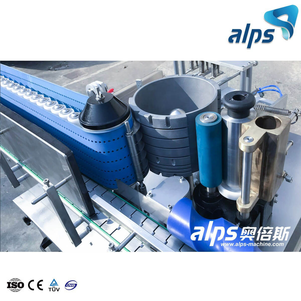 This automatic bottle cold glue labeling machine adopts the design first in stick mark scalloped turned pole again by rubber wheel stick take a few glue and then to label transmission device in sticky get a tag,to vacuum suction paper roller position,by off label grasp take off label.At the same time will label switched to vacuum sheet transfer belt,use the vacuum suction,make tags adhere to the sheet transfer belt into the labeling area,make tags enclosed by chain coveyor esther in the bottle.So circulates movement,the complete machine production process.